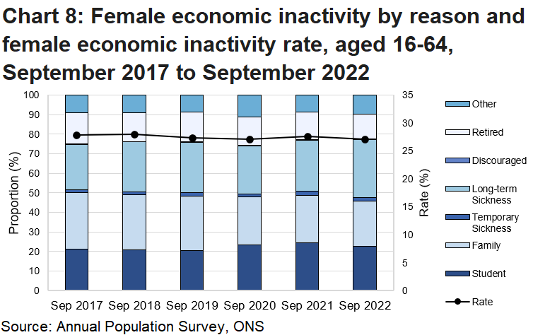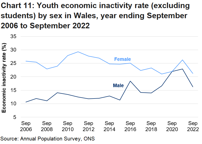 The youth economic inactivity rate for males in the year ending September 2022 was 16.3%, a decrease of 6.6 percentage points compared to the previous year, and the rate for females was 21.2%, a decrease by 5.1 percentage points. This series can be volatile and short-term changes should be treated with caution.
