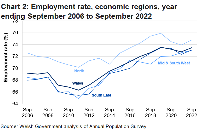 The employment rate in North Wales was 74.8%, an increase of 0.9 percentage points, in Mid & South West Wales the rate was 73.0%, an increase of 0.4 percentage points and in South East Wales the rate was 73.1% an increase of 0.7 percentage points. North Wales continued to have the highest employment rate of the three economic regions (Differences calculated using unrounded figures).