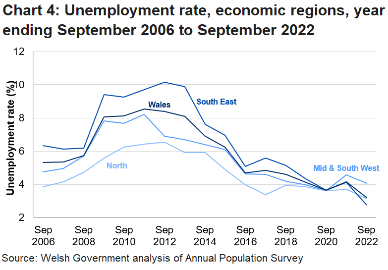 The overall trend for Wales and the three economic regions across the previous four years saw decreasing unemployment rates before the coronavirus (COVID-19) pandemic, with the rate remaining consistently higher in South East Wales and consistently lower in North Wales compared to the other regions. Since 2020, the unemployment rate for Wales and the three economic regions has diverged, with Mid & South West Wales having the highest rate from 2021 onwards.