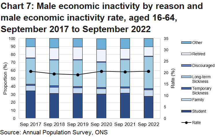 In the year ending September 2022, the most common reason for economic inactivity for men in Wales was long-term sickness, which increased by 6.0 percentage points over the year to 39.9% of all economically inactive males. This was followed by being a student accounting for 27.7% of all economically inactive males, down by 3.9 percentage points from a year earlier.