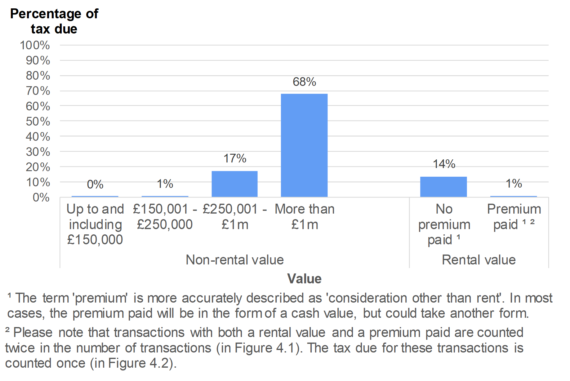 - Figure 4.1 shows that while only 6% of these transactions had a non-rental value of more than £1 million, these transactions accounted for just over two thirds of the non-residential tax due (Figure 4.2).