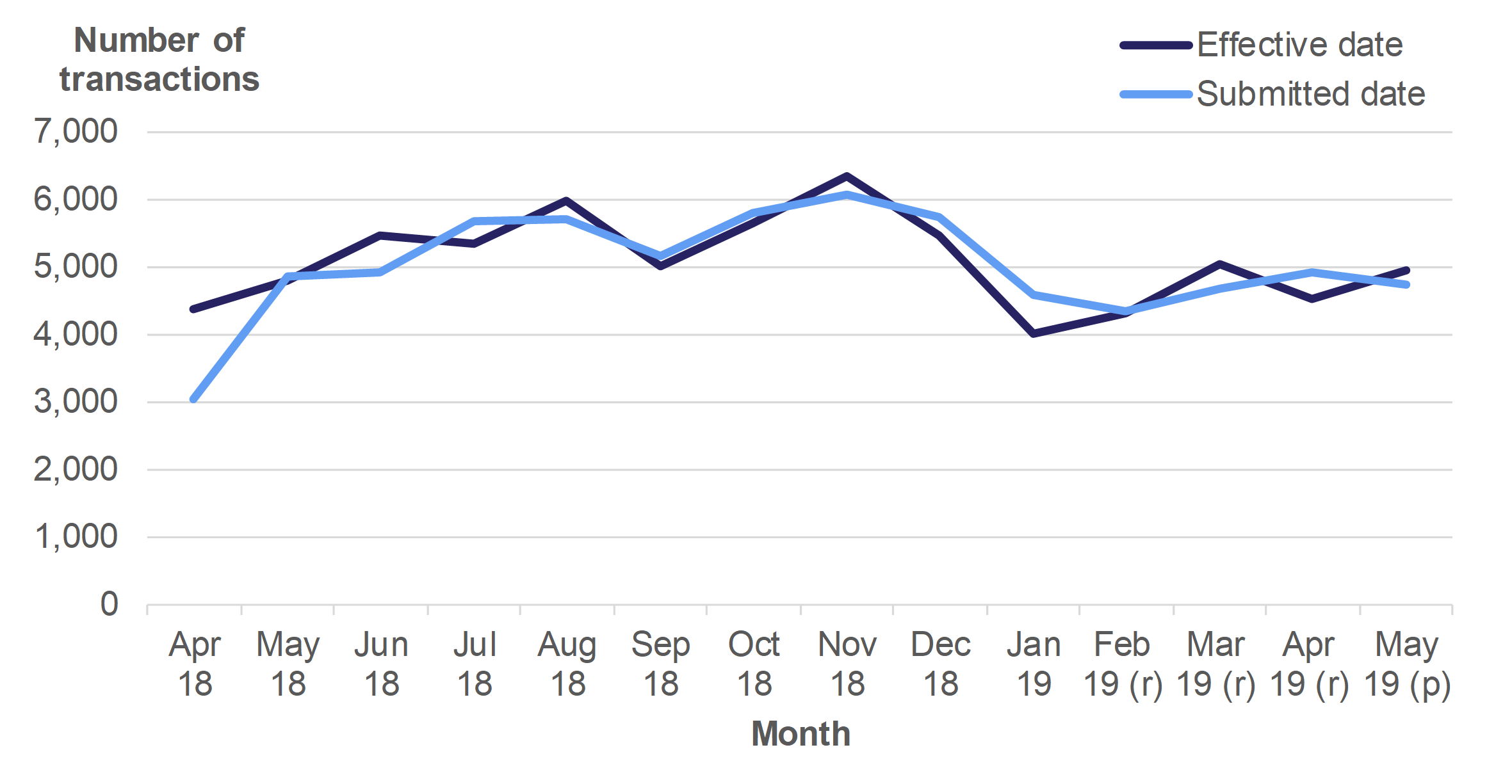 - In January 2019, 560 more transactions were submitted than were effective. This is likely to have been due to Christmas holidays and the submission in January 2019 of a greater volume of transactions effective in December 2018.