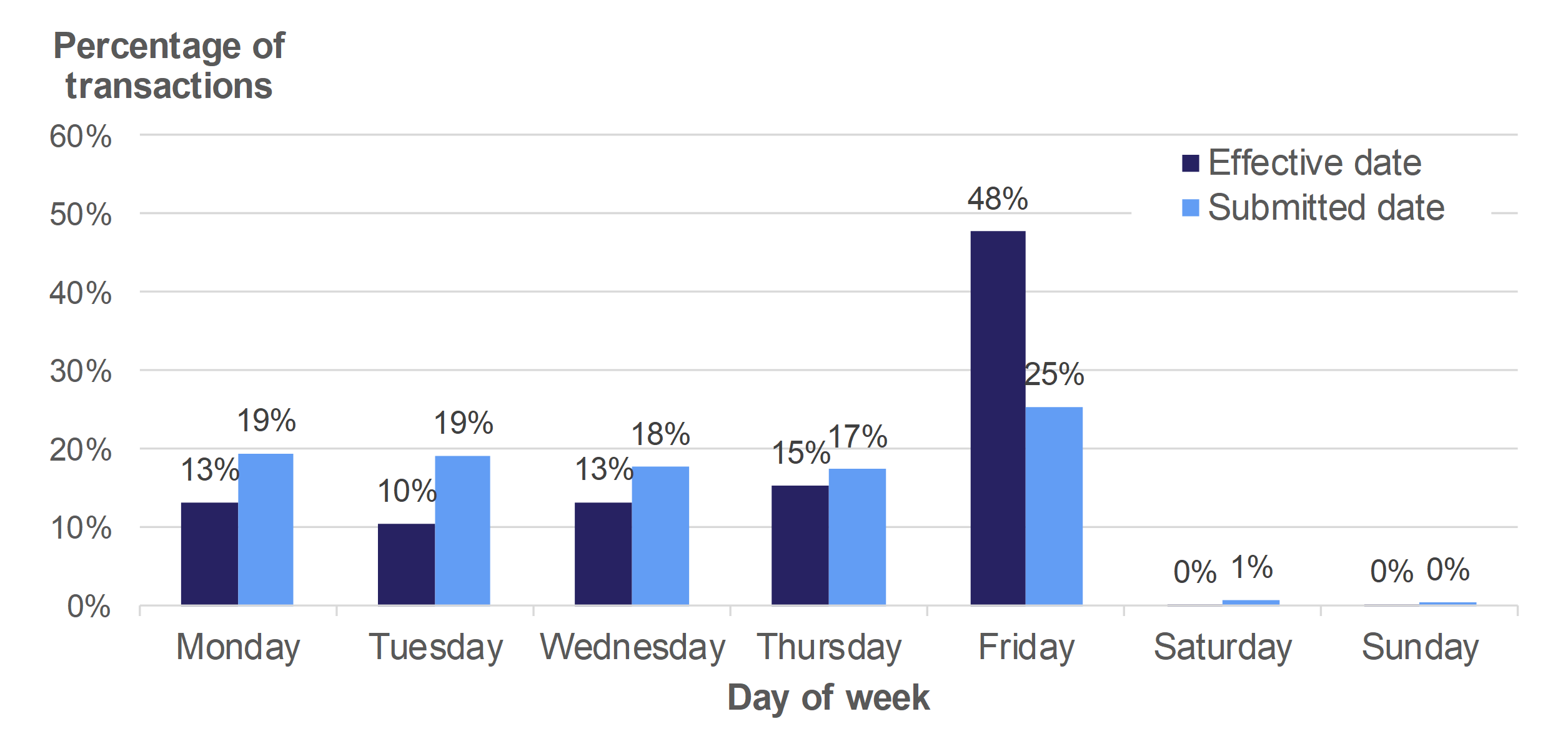 Nearly half of transactions effective in 2018-19 became effective on a Friday. While an above average proportion of returns were submitted on a Friday, the difference is far less pronounced than for effective date. This suggests that returns are generally not submitted on the same day that the transaction completes.