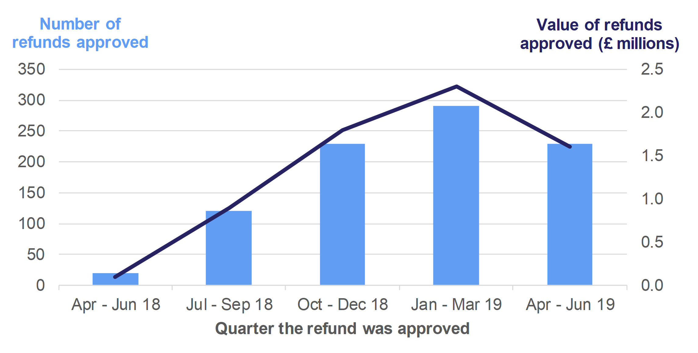 The number of refunds approved (and value of those refunds) increased during each quarter in 2018-19, reflecting expectations as sufficient time has passed for claims to be made. There has been a fall in the data for quarter 1 of 2019-20, but it should be noted that only refunds approved up to 17 June 2019 are included in Figure 6.2 (namely, that the data for quarter 1 of 2019-20 is not yet complete).