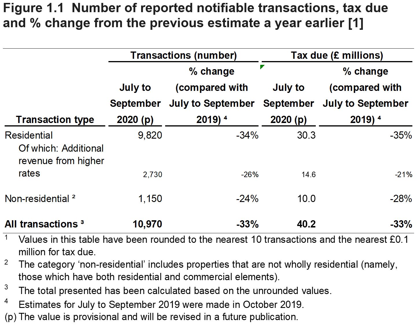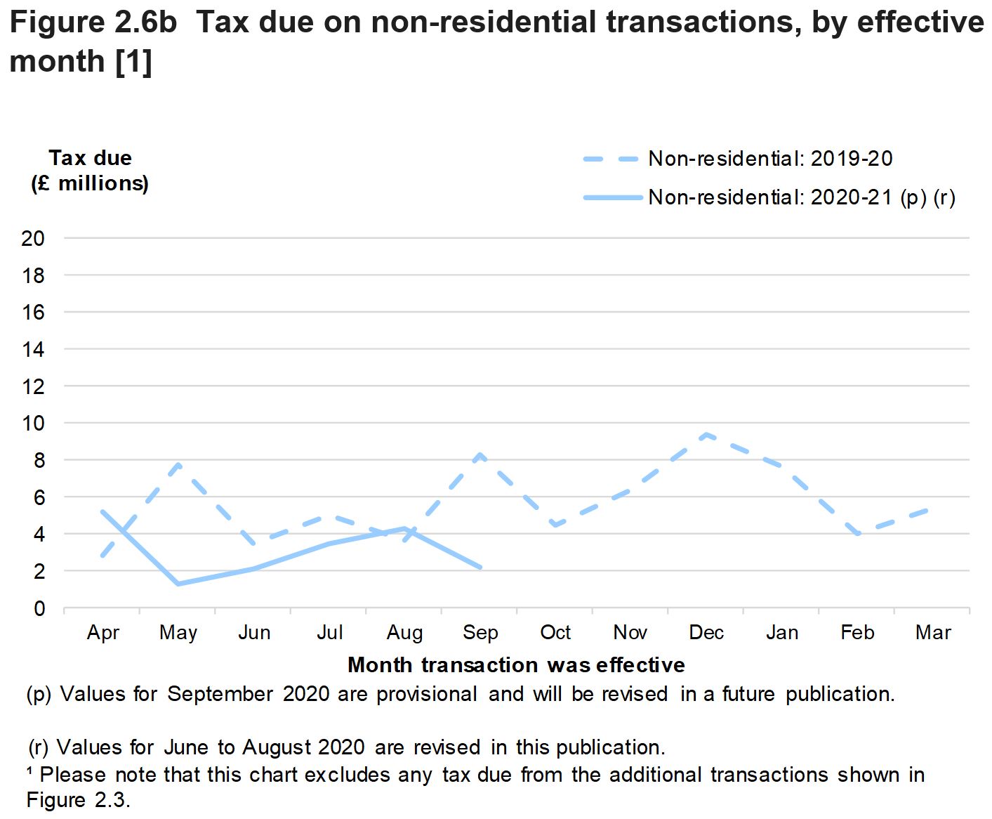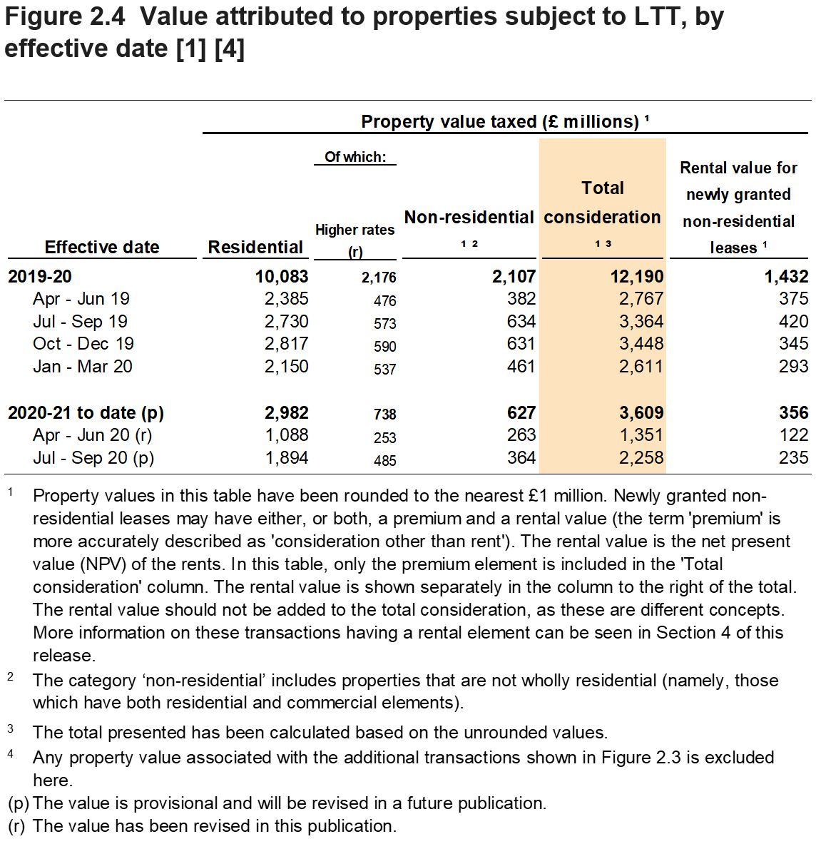 The value of property taxed in July to September 2020 was £2.2 billion, lower than the £3.4 billion seen in July to September 2019.