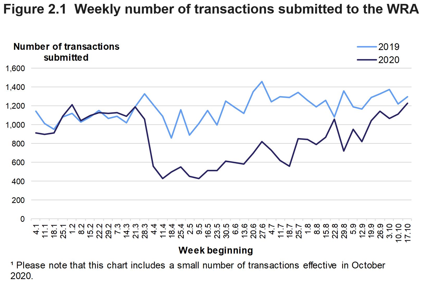 Figure 2.1 above shows the total number of transactions submitted to the WRA in each 7-day period. These periods begin on a Saturday and end on the following Friday. For example, the point ’17.10’ in 2020 shows the number of residential and non-residential transactions submitted to the WRA from 17 to 23 October 2020 (inclusive). The actual dates differ slightly in the previous year. For example, the same week in 2019 ran from 19 to 25 October 2019 (inclusive).