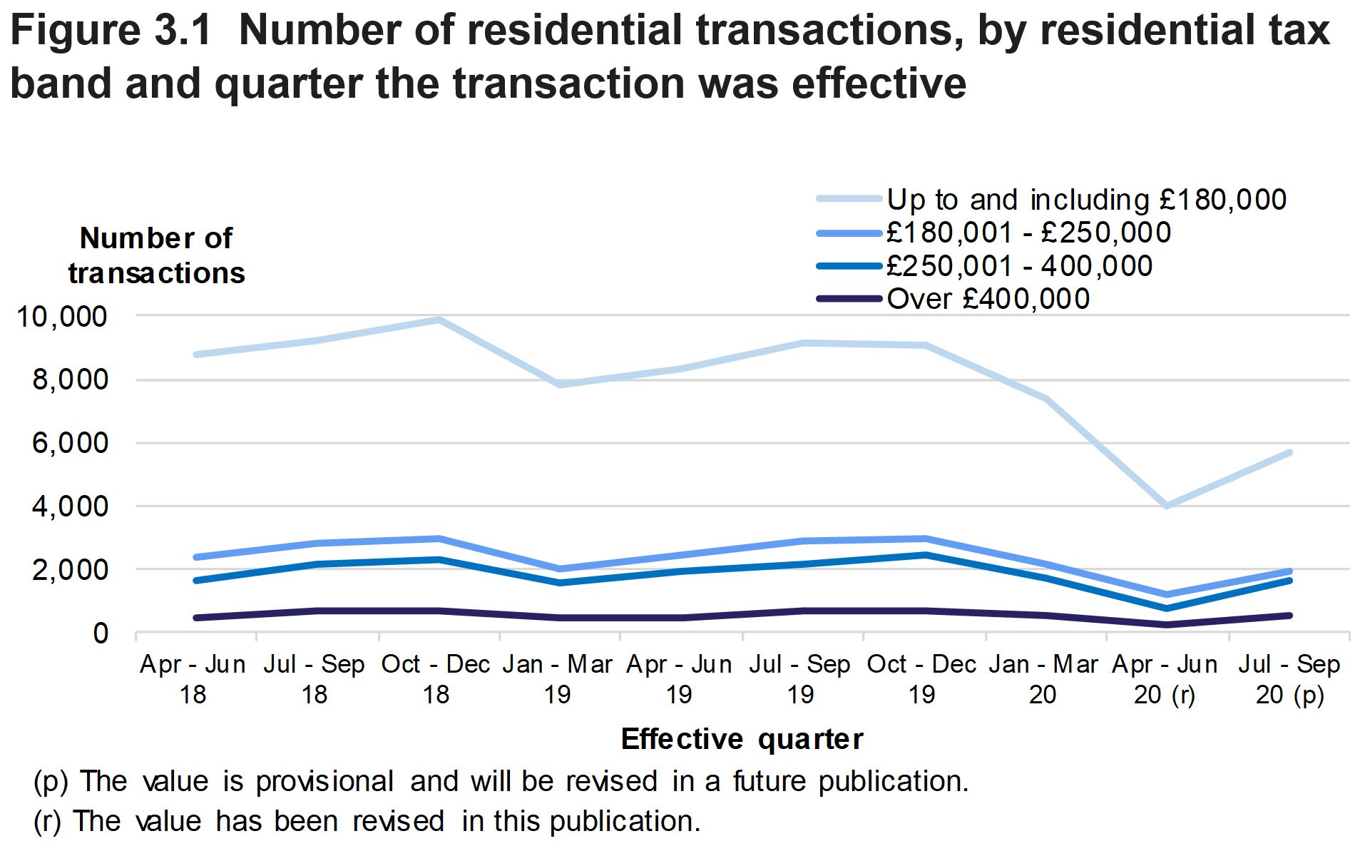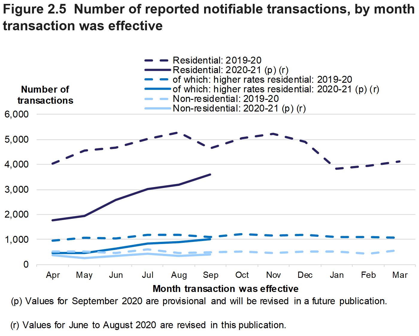 The national lockdown imposed on 23 March 2020 resulted in the housing market being mainly closed until it was partially re-opened on 22 June. At that point, house viewings could take place in vacant properties along with house moves where a sale has been agreed but not yet completed. The market was then more fully opened on 27 July to coincide with a change in LTT rates effective until 31 March 2021. Although there were some further local lockdowns imposed towards the end of the period reported in this release (end September 2020), these do not appear to have had any significant impact on transaction counts.