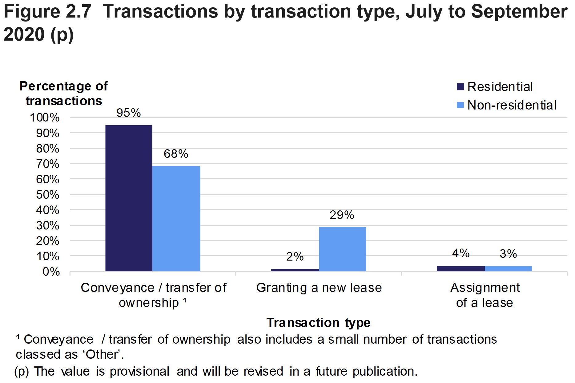 Most transactions in July to September 2020 were associated with a conveyance or a transfer of ownership. This figure was 95% for residential transactions and 68% for non-residential transactions.