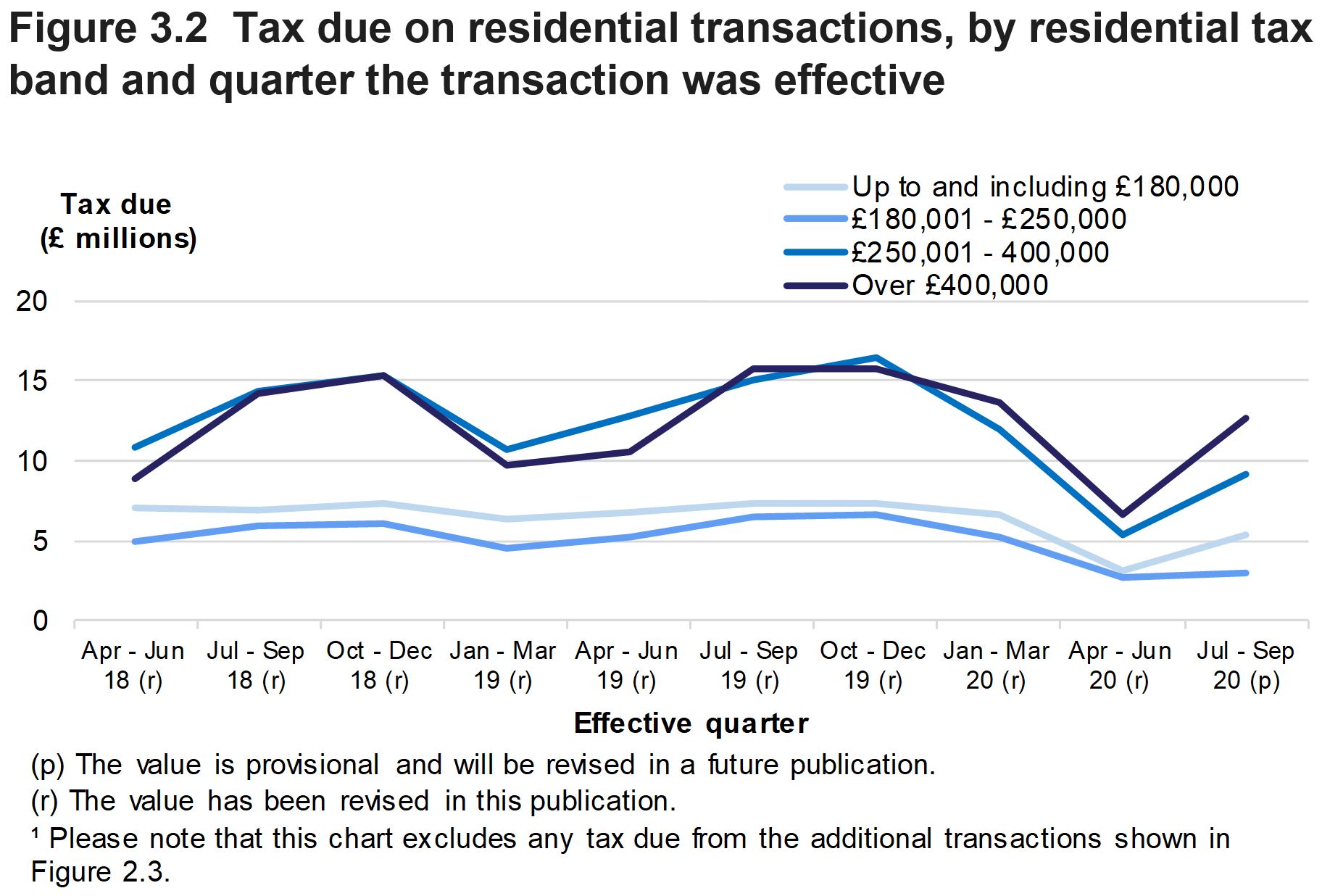 Excluding the transactions described above, the total tax due for transactions with an effective date in July to September 2020 was £40.2 million. This value is a third lower than our estimate for July to September 2019 (published in October 2019).