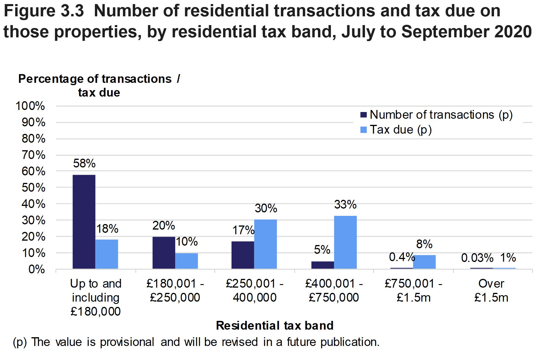 Combining the fourth, fifth and sixth bands (purchase price of greater than £400,000), these accounted for only 5% of transactions. However, the tax due for these transactions accounted for 42% of the total residential tax due.