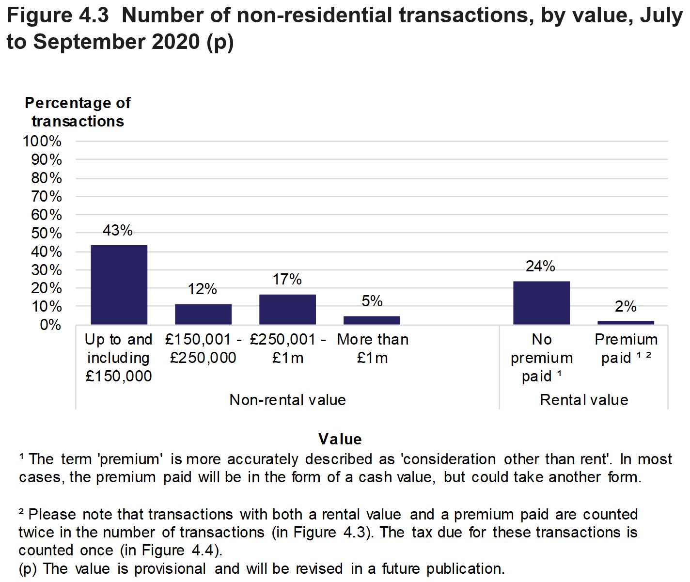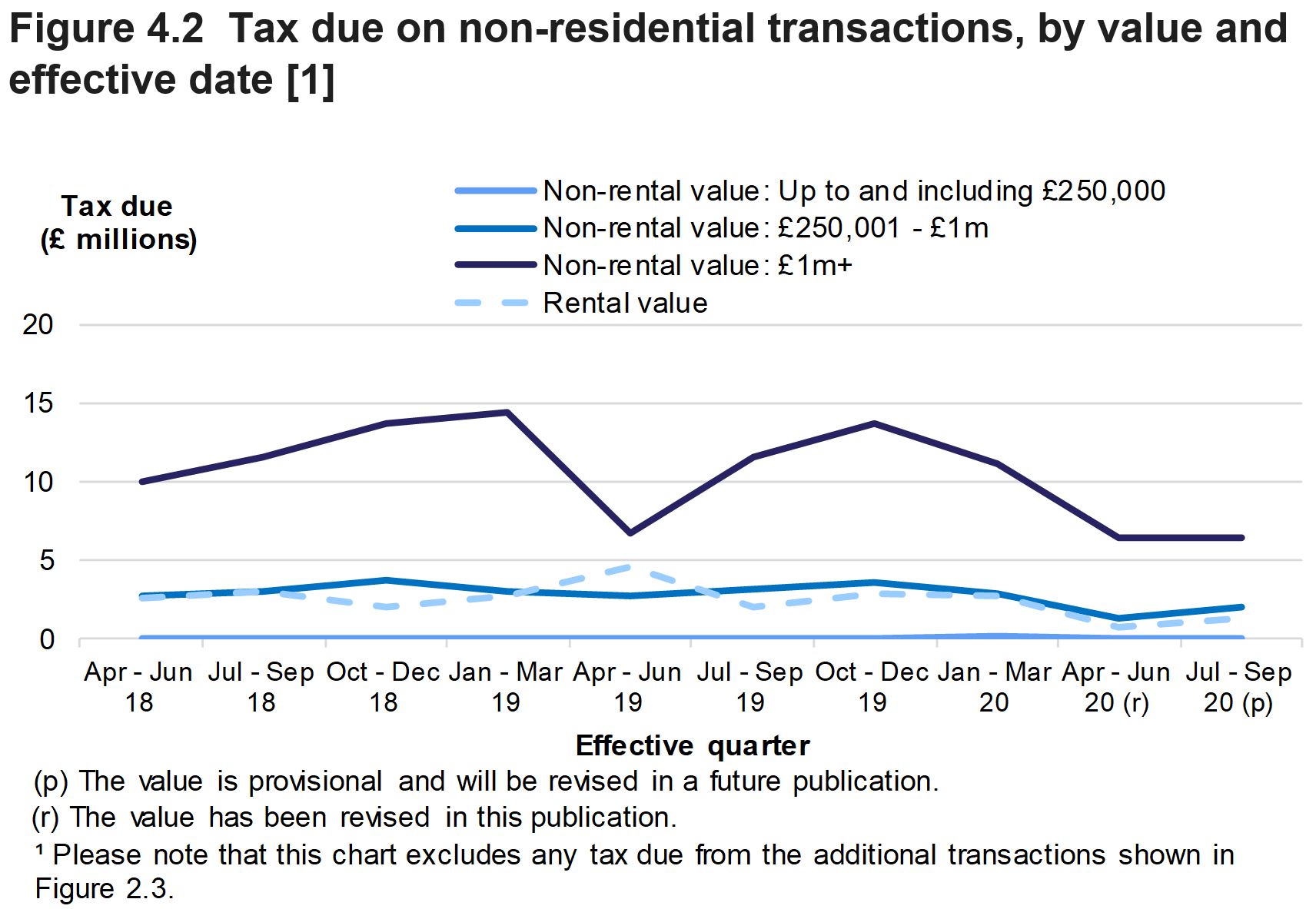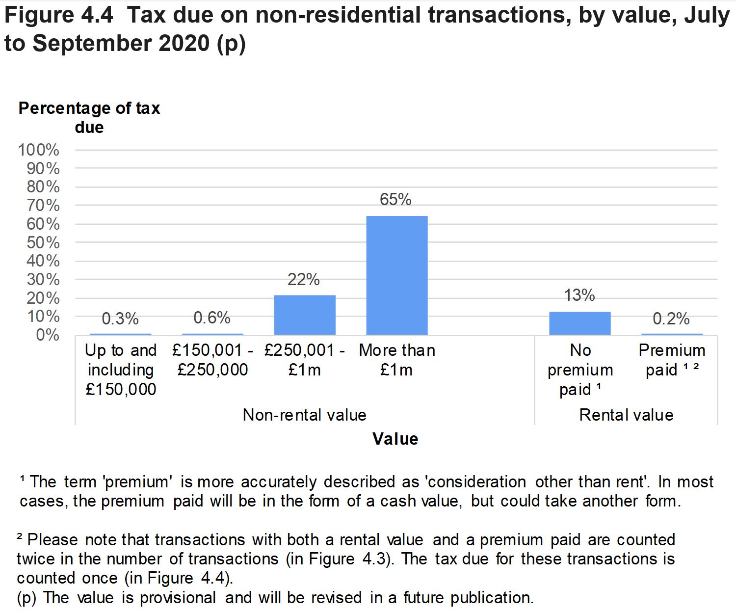 Figure 4.3 shows that in July to September 2020, 5% of non-residential transactions had a non-rental value of more than £1 million. These transactions accounted for 65% of the non-residential tax due (Figure 4.4).
