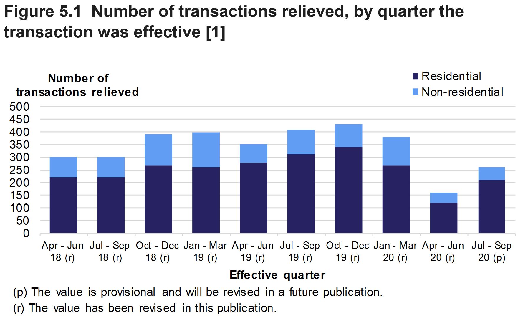 There were 260 transactions in July to September 2020 with reliefs applied to them that reduced the associated tax due. This is the second lowest quarterly value seen to date. The lowest quarterly value seen to date was the 150 relieved transactions seen in April to June 2020. These effects are due to the impact of coronavirus (COVID-19) on the property market from April 2020 and the LTT rate change on 27 July 2020.