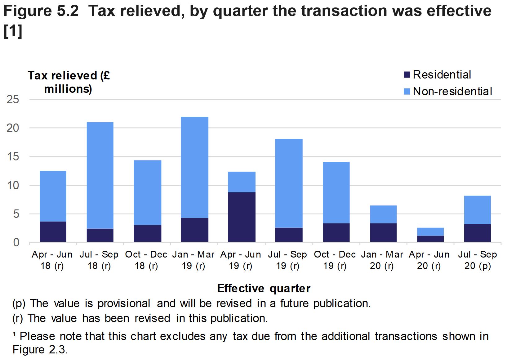 However, several large residential transactions in April to June 2019 contributed to residential reliefs being considerably larger than non-residentials reliefs in this period. Also, in January to March 2020 and April to June 2020, non-residential transactions contributed around half of the value of reliefs.