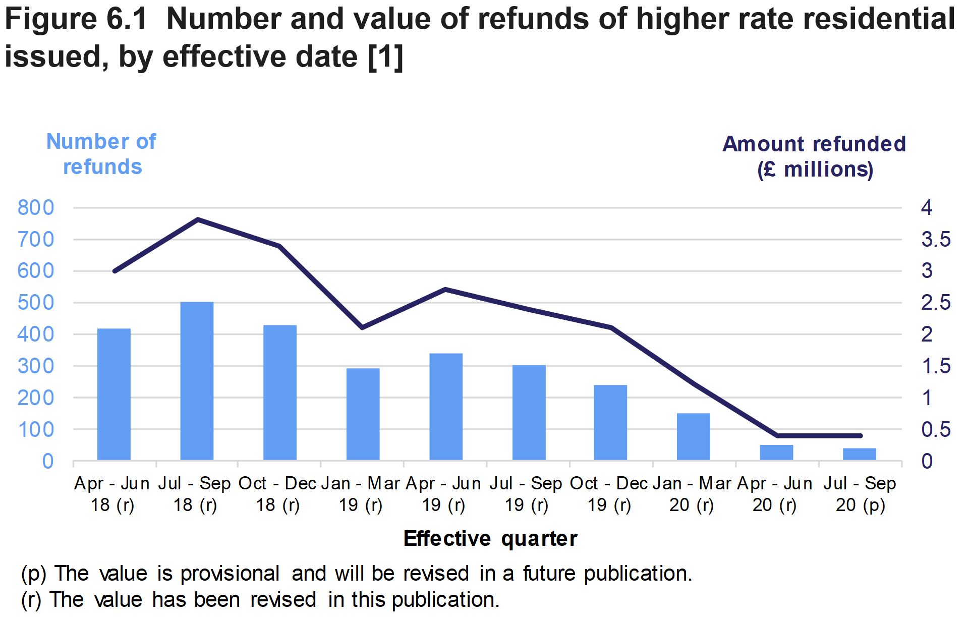 The number and value of refunds presented for April to June and July to September 2020 are lower than for earlier periods. This is because compared with earlier periods, not enough time has passed since the transaction was effective for many of the relevant taxpayers to sell their previous main residence and claim their refund.