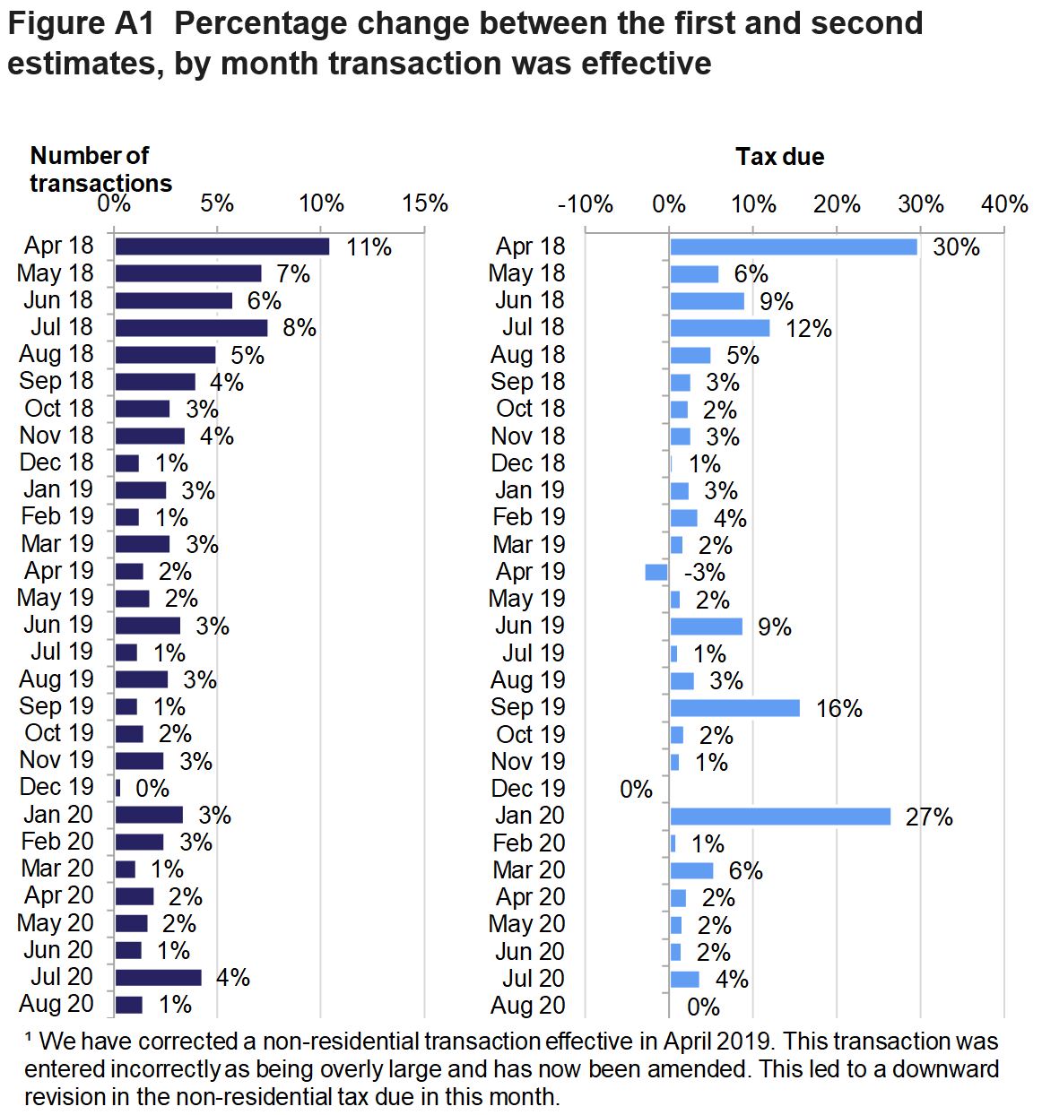 However, in our monthly and quarterly statistics, we are gradually revising downwards the tax due for earlier periods. This is because of higher rate refunds being paid out in each month (for higher rates residential transactions which were effective in earlier periods, back to April 2018).