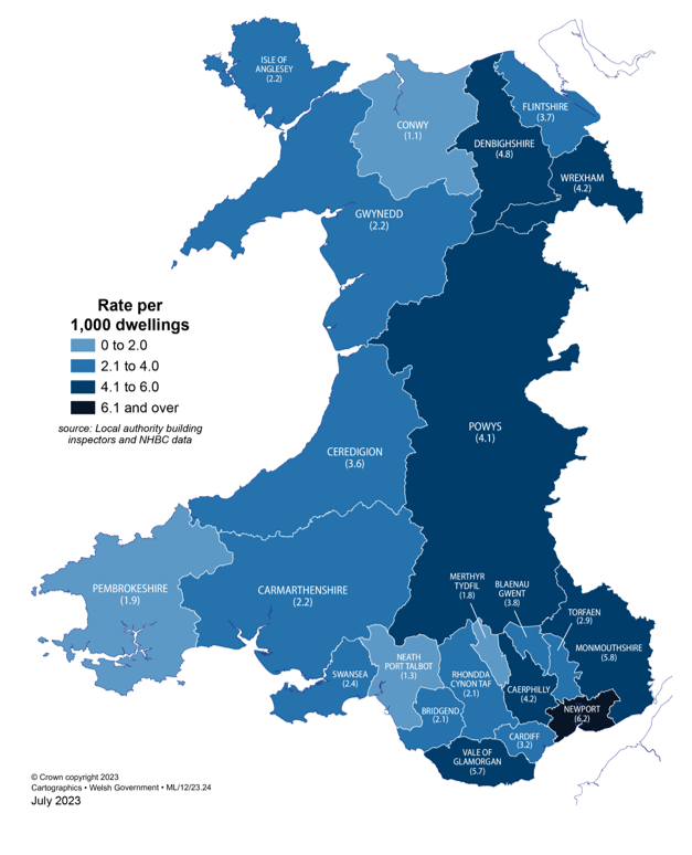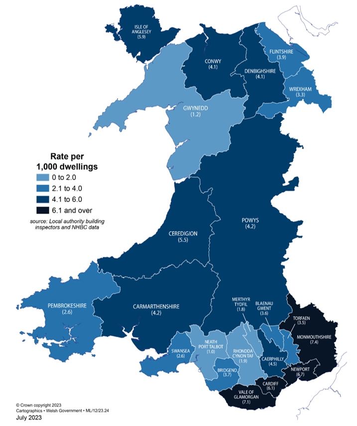 The rate of new dwellings started per 1,000 existing dwellings ranged from 1 in Conwy and Neath Port Talbot (where 64 and 83 new dwellings were started respectively) to 6 in Monmouthshire, Vale of Glamorgan and Newport (where 247, 343 and 426 new dwellings were started respectively).