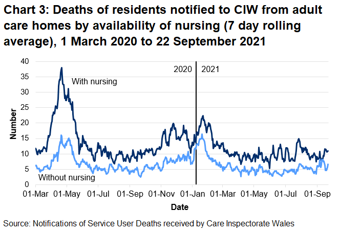 - From 1 March 2020 to 22 September 2021, CIW have been notified of 7,379 deaths (66.5%) with nursing and 3,711 deaths (33.5%) without nursing in adult care home residents.