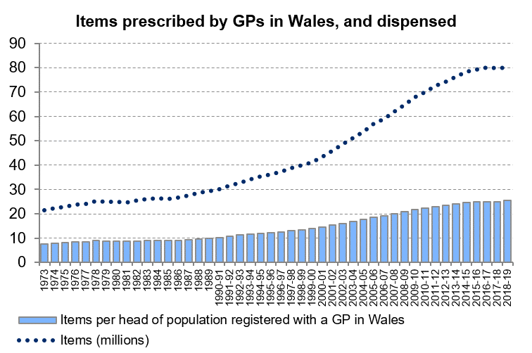 - 80.1 million items were prescribed by GPs in Wales and dispensed during 2018-19, up from 79.9 million (0.3%) in the previous year.