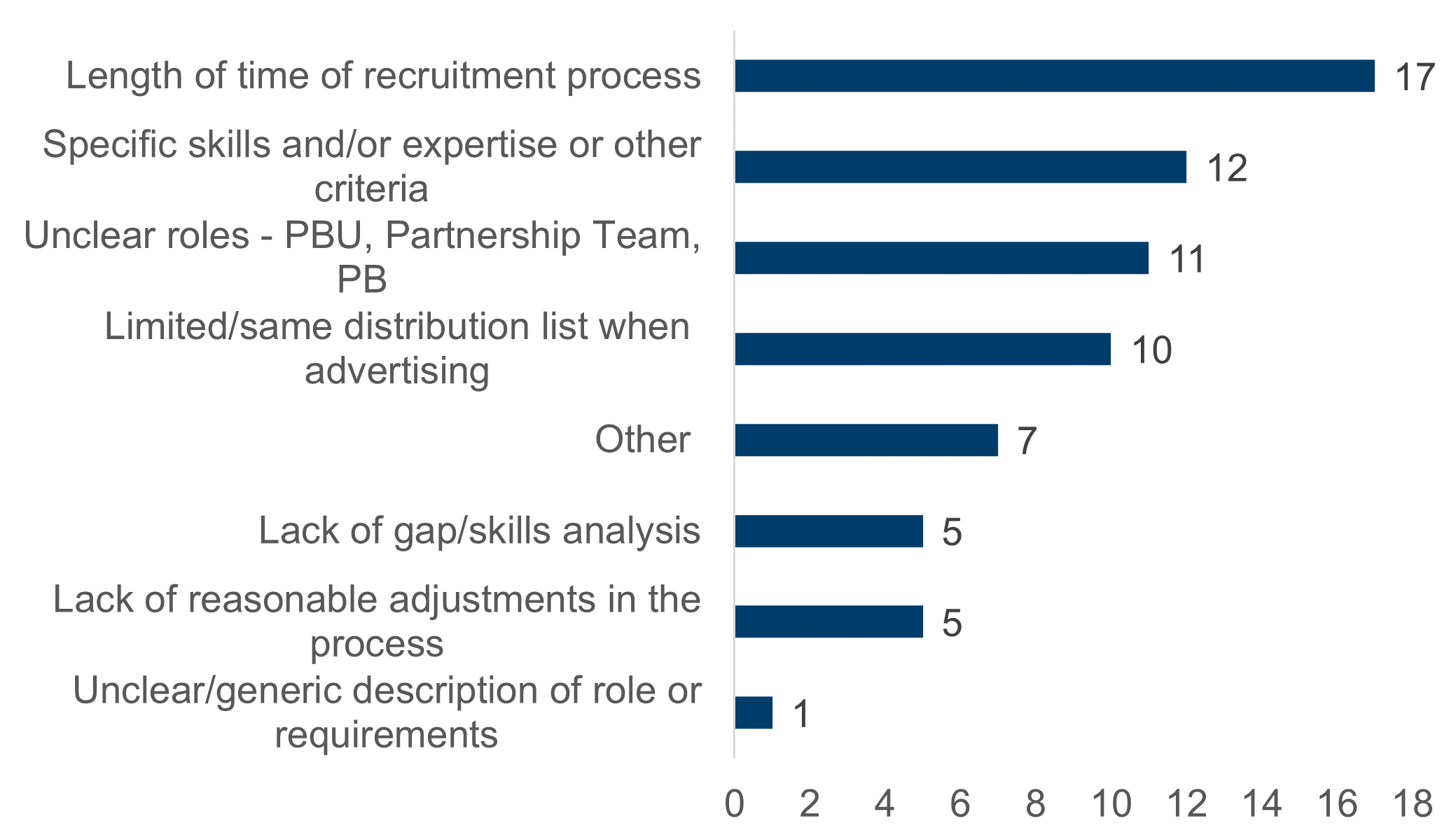 - Many Board members commented on the lack of timely or unclear communication during the recruitment process, as well as the variability in the clarity of role specifications and / or characteristics and the lack, or inadequacy of feedback to unsuccessful applicants.