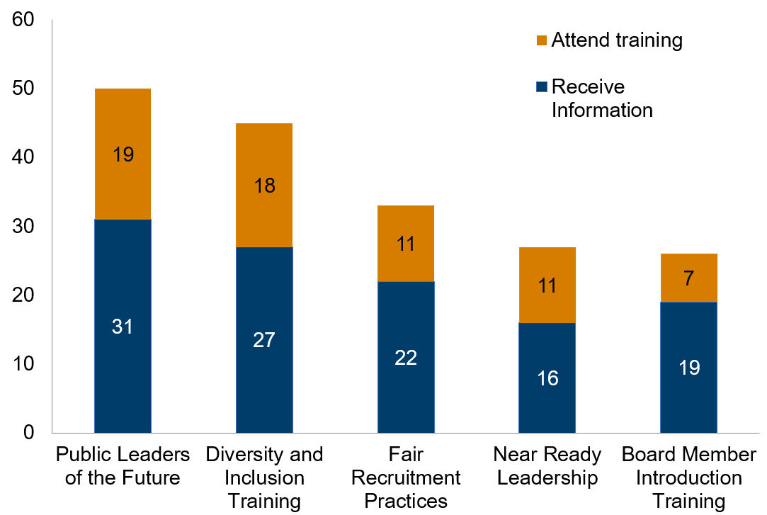 Training was procured for Board members and prospective Board members in 2022-24, which resulted in 208 delegates participating in the 5 modules, ‘Near Ready Leadership’, ‘Fair Recruitment Practices’, ‘Public Leaders of the Future’, ‘Board Member Introduction’, and ‘Diversity and Inclusion’. This also included unsuccessful applicants who benefitted from training