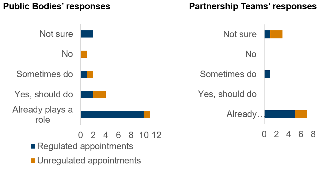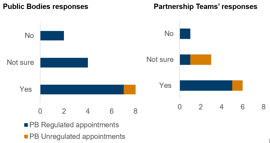 4.1 Two surveys were developed to gather information on Board recruitment practices and experiences. A survey was sent to PBs’ senior leadership teams and their respective Welsh Government Partnership Teams and a separate survey to Board members to capture their experiences and thoughts on best practice. Appendix 1, the ‘Survey List’ shows the PBs included in this Review. All PBs Board members’ surveys were sent via the Partnership Teams and / or CEOs, with roughly half sent directly to Chairs.