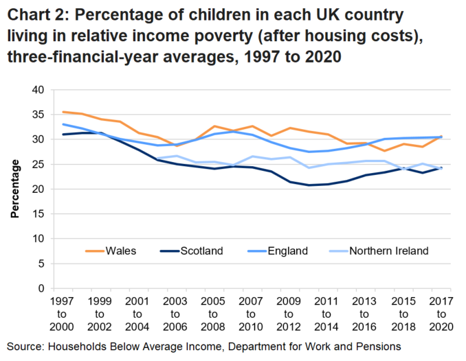 - In England the percentage of children living in relative income poverty was 30% between 2017 and 2020. Although this is slightly lower than the rounded figure for Wales the difference is less than 0.2 percentage points on unrounded data. In Scotland and Northern Ireland the figure was 24%. (chart 2)