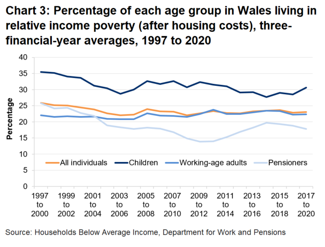 - Between 2017-18 and 2019-20, 23% of all people in Wales were living in relative income poverty.