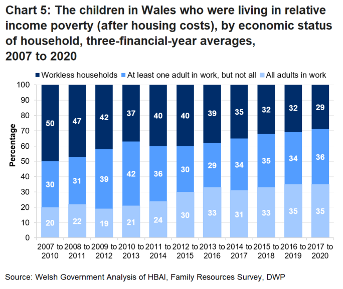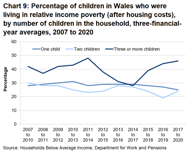 - In Wales, 31% of children were living in relative income poverty in 2017 to 2020. This figure has increased from 28% reported last year and is a 2 percentage point increase based on the unrounded data. However, please take care when interpreting change over the short term because trends can be volatile due to small sample sizes.