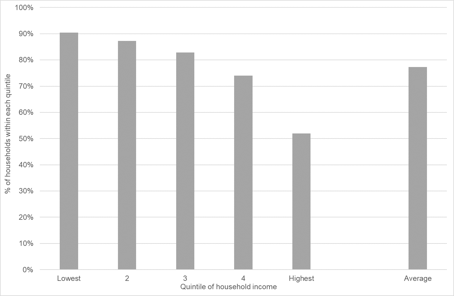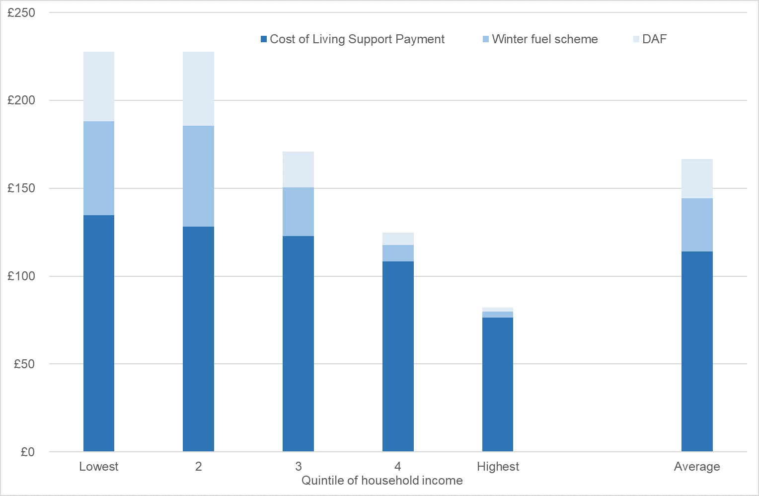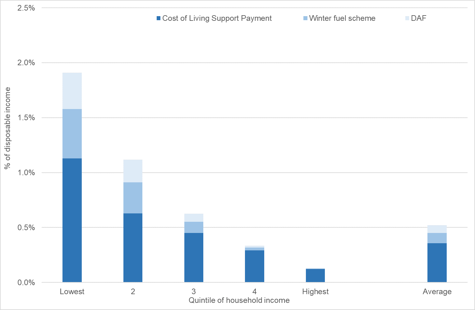 Figure 1 shows the percentage of households who are benefiting from the total support package by quintile. This is mainly driven by the Cost of Living Support scheme. In total around 75% of households are expected to be supported by one or more of these schemes.
