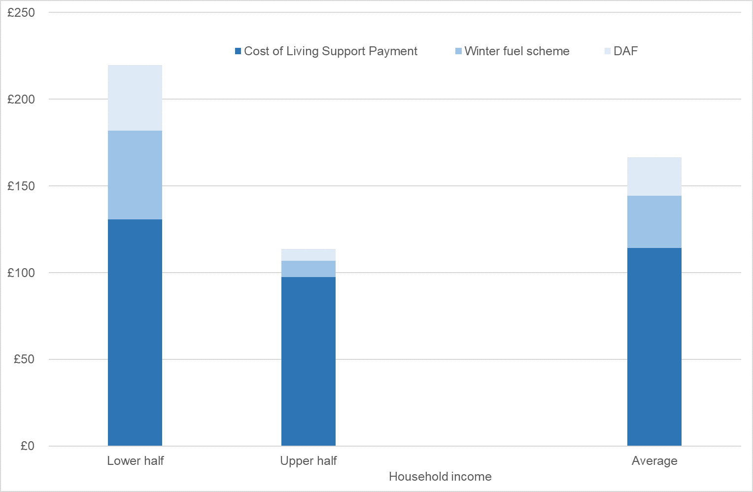 Figures 2 and 3 show the average cash value of the support package across each of the schemes by household income. The Cost of Living Support scheme forms the largest financial element of the package for households, but the other two schemes provide substantial additional funding to those on lower incomes. Figure 2 shows that nearly three times as much funding will go to households in the bottom fifth of the income distribution compared to those in the top fifth. Figure three shows nearly twice as much funding will go to households in the bottom half of the income distribution compared to those in the top half.