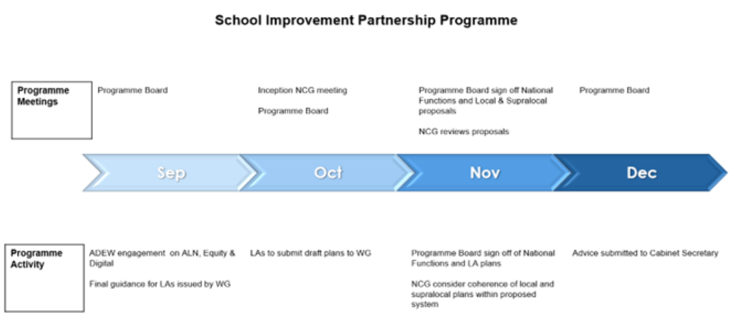 The focus of the September meeting was a discussion on managing the risks and issues that may affect the successful delivery of the programme. Key amongst these are the tight times, effective communication and how we will know the delivery of the programme has provided value for money and addressed points raised in the review of school improvement (the roles and responsibilities of education partners in Wales).