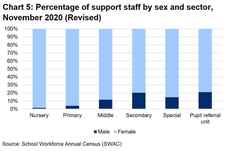 - Of all support staff in maintained local authority settings in Wales, 90.9% (r) were female. The proportion of support staff which was female ranged from 78.9% (r) in PRU’s to 98.7% in nursery schools. Females accounted for 96.1% (r) of support staff in primary schools and 79.9% (r) in secondary schools.