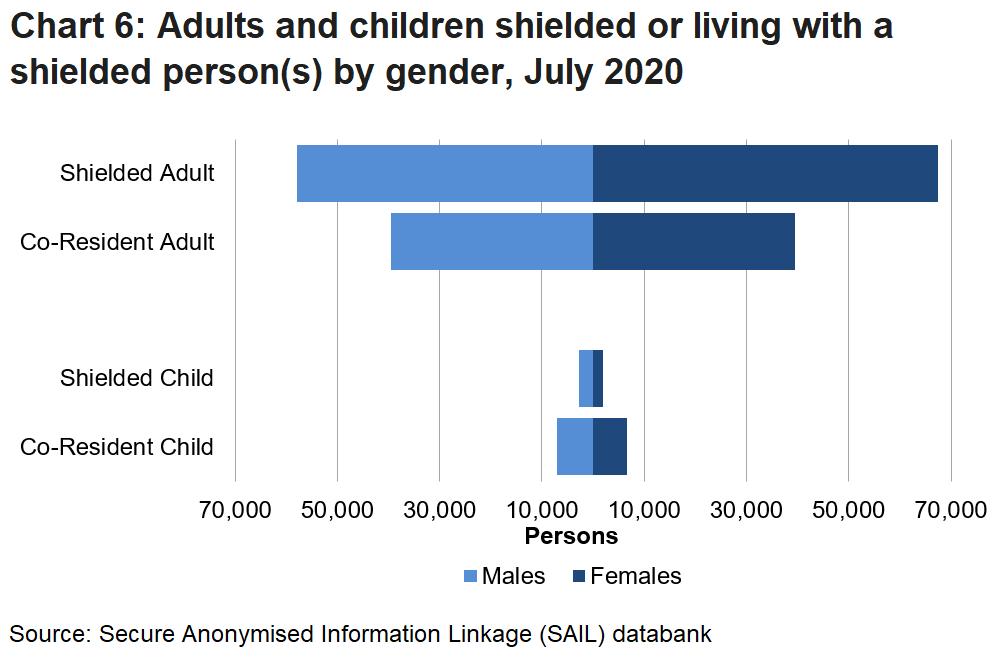 By July 2020 over 130,000 people in Wales had been asked to shield; of these less than 5,000 were children under 18 years of age. Over 92,000 people were identified as living with a shielded person so that over 223,000 people were estimated to be living in shielded households. Of those living with someone shielding, around 79,000 were adults and over 13,000 were children. The majority of children (74%) were living with someone asked to shield rather than being asked to shield themselves.