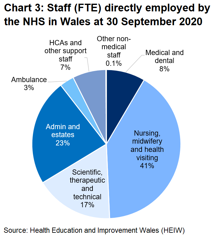 At 30 September 2020, almost half of the staff directly employed by the NHS in Wales were either medical and dental staff, or belonged to the nursing, midwifery and health visiting group. The nursing, midwifery and health visiting group was the largest staff group, accounting for 41% of all staff.
