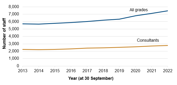 Hospital medical staff (FTE), which is a subset of medical and dental staff, have increased by 30.4% since 2013, and by 5.0% since 30 September 2021, to 7,450 on 30 September 2022.