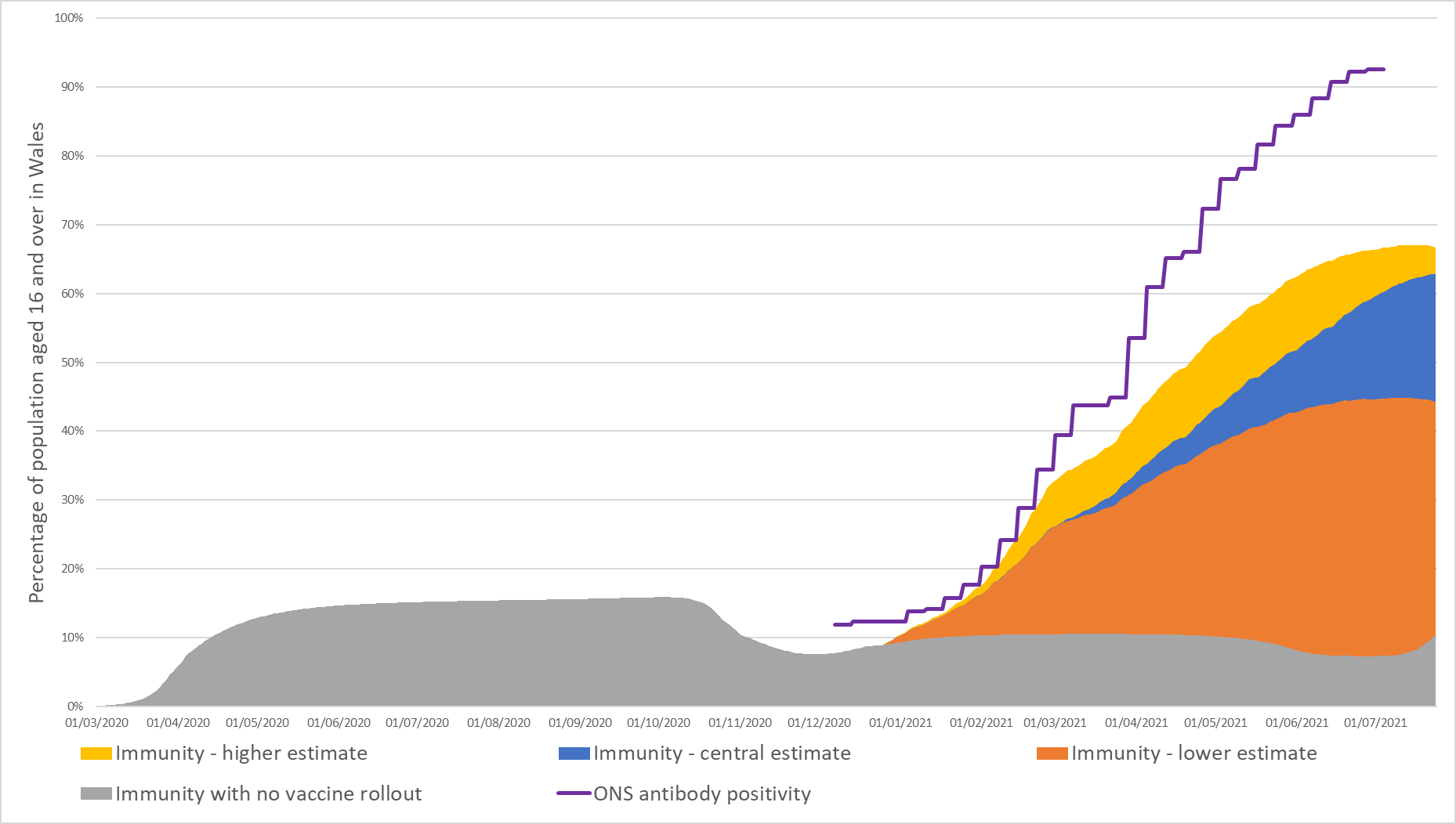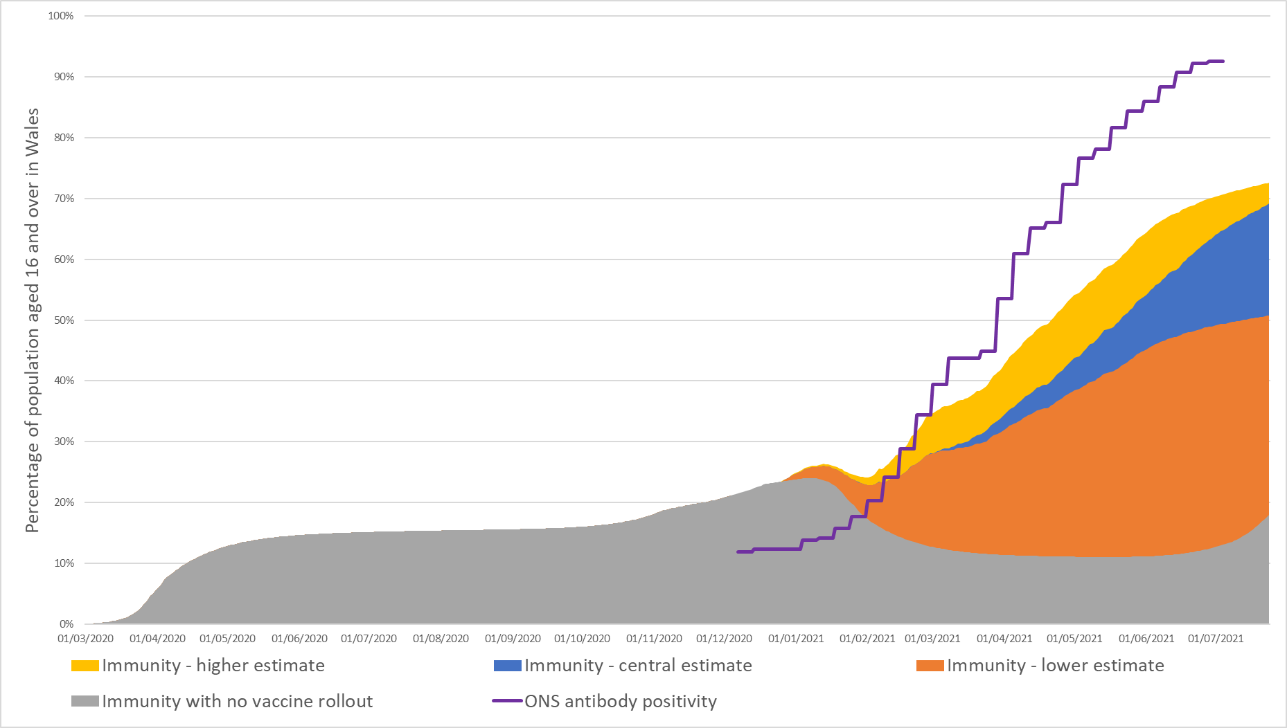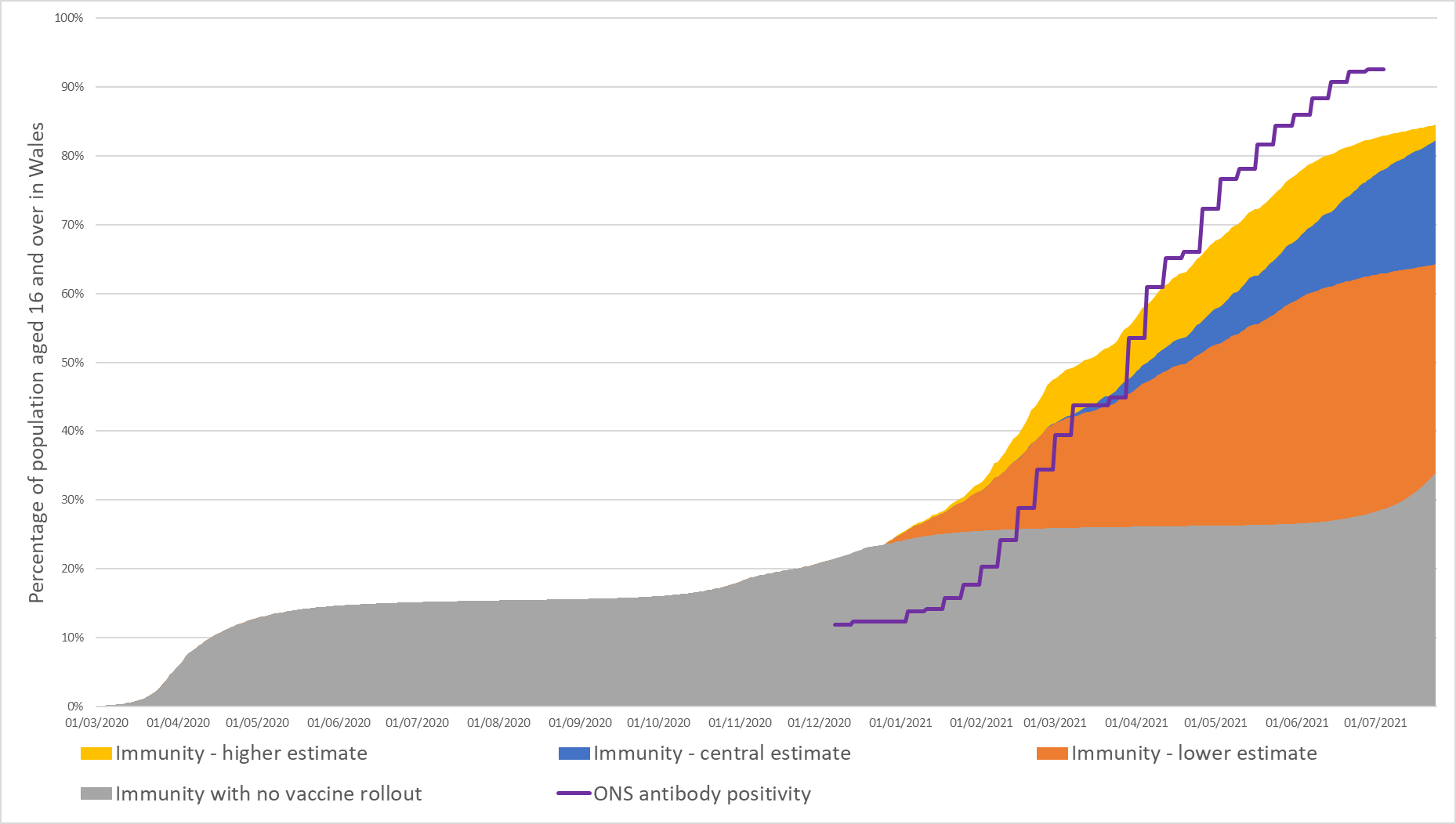 Immunity levels in the population have been significantly increased by the vaccine rollout. If no vaccines had been administered, it was estimated that 34% of people aged 16 and over in Wales (32% of the total population) would have had some immunity against COVID-19 infection at 24 July 2021.