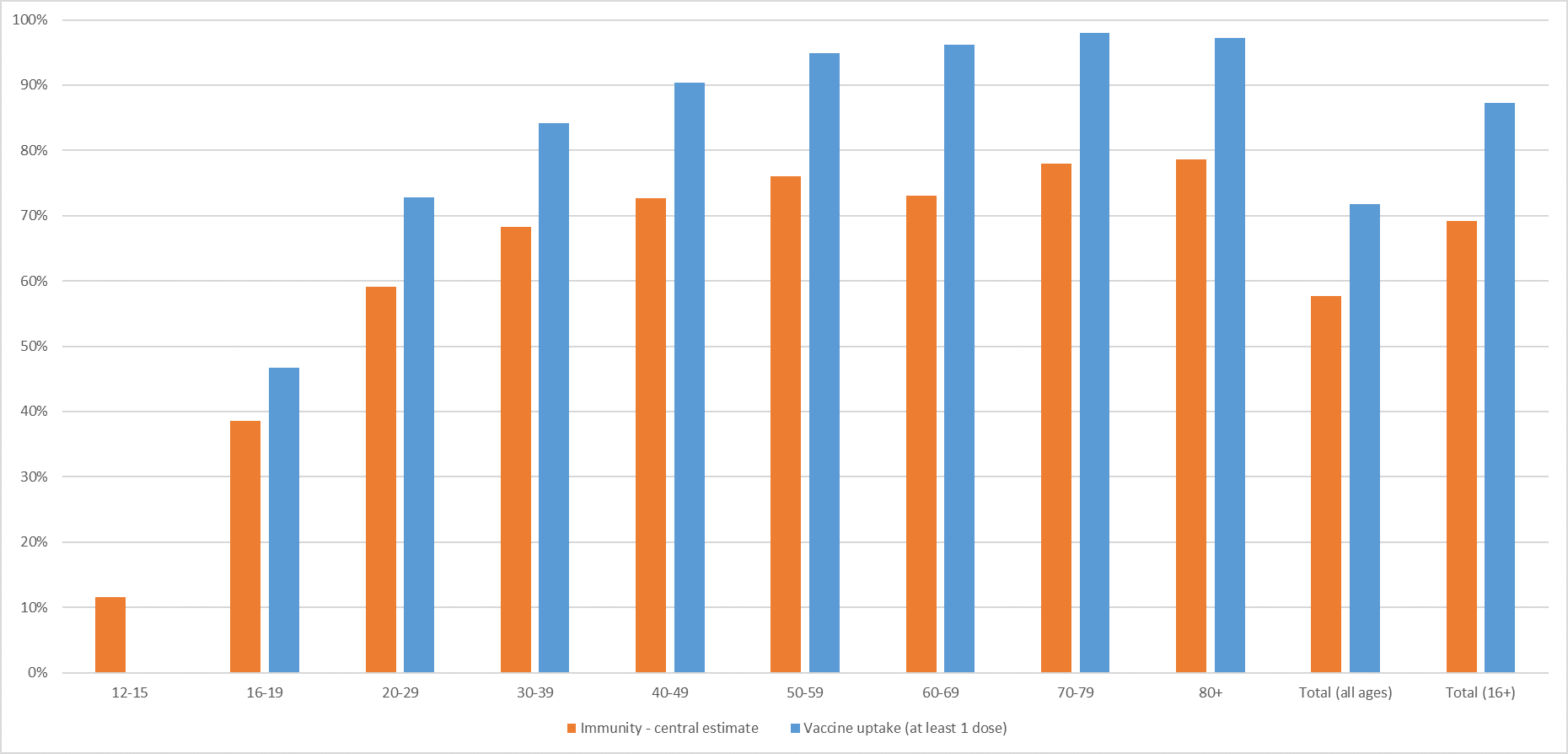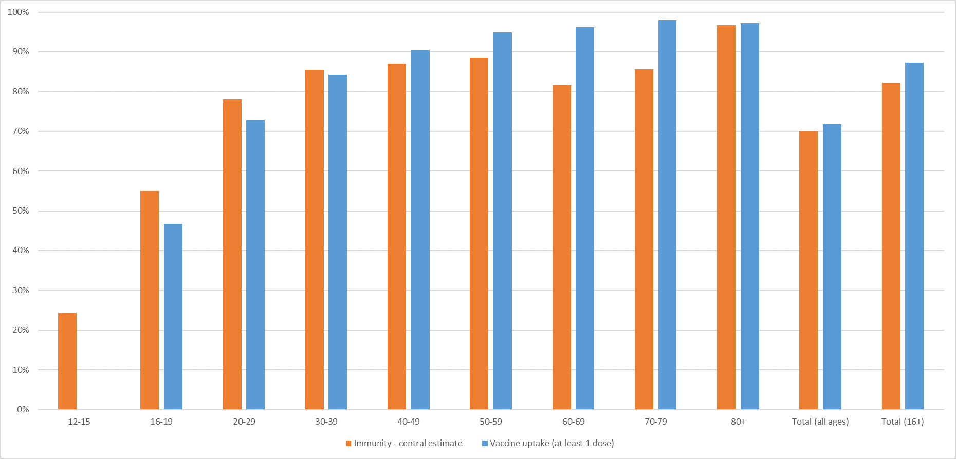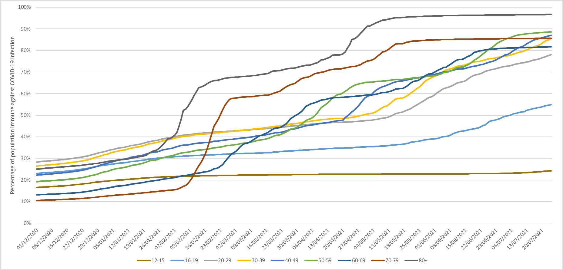 Immunity levels varied across age groups. Highest immunity was estimated in individuals aged 80 and over at 97% [70%, 97%] at 24 July 2021. Lowest immunity (excluding individuals aged under 16) was estimated in individuals aged 16 to 19 at 55% [53%, 61%] at 24 July 2021.