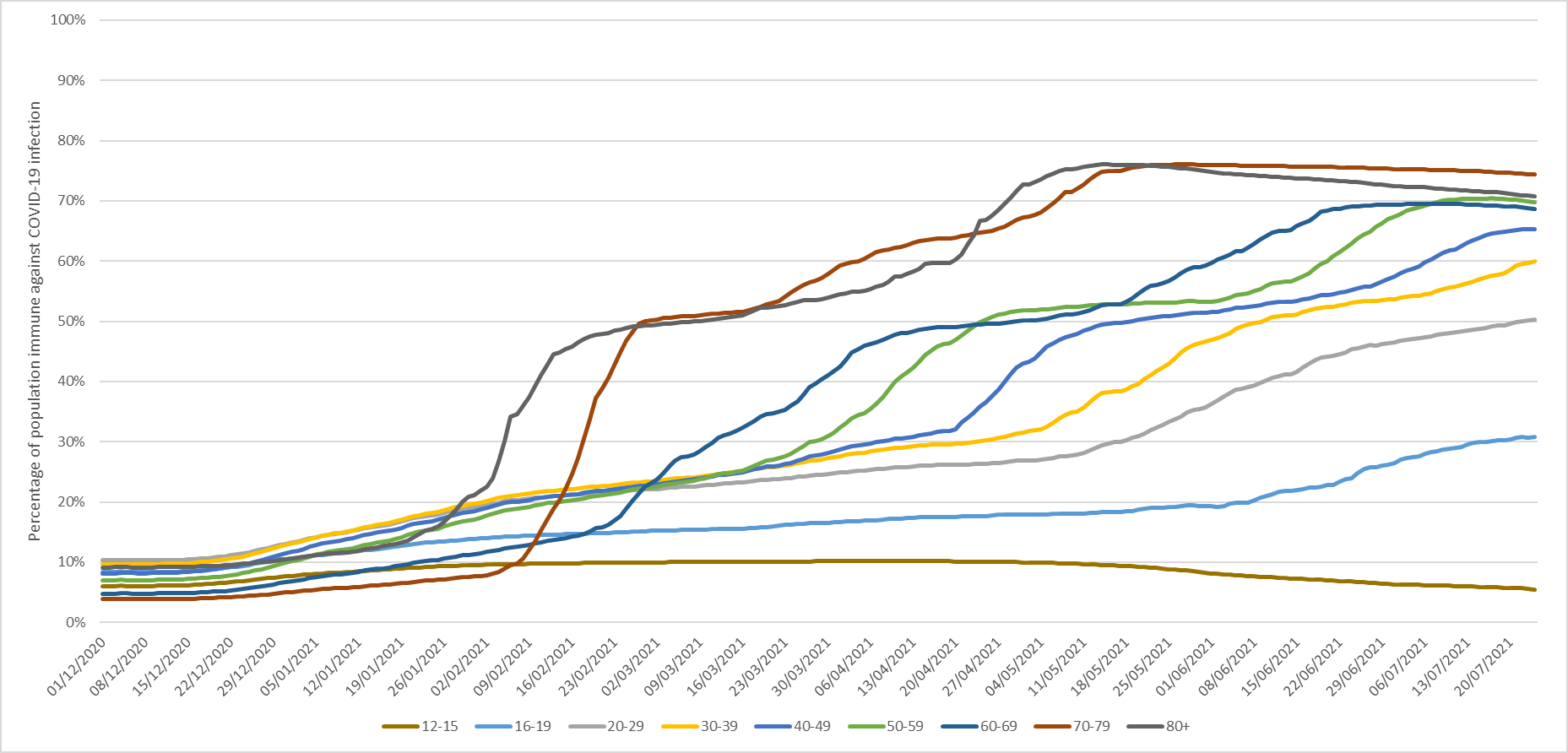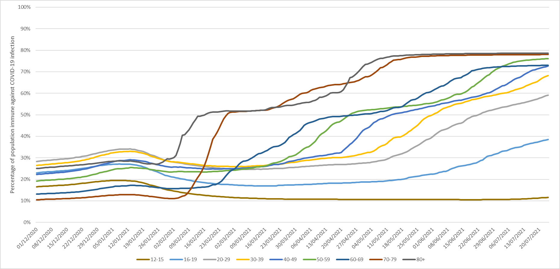 Figure 4: Immunity estimates in Wales, by age group, to 24 July 2021, assuming immunity wanes after 2 years.
