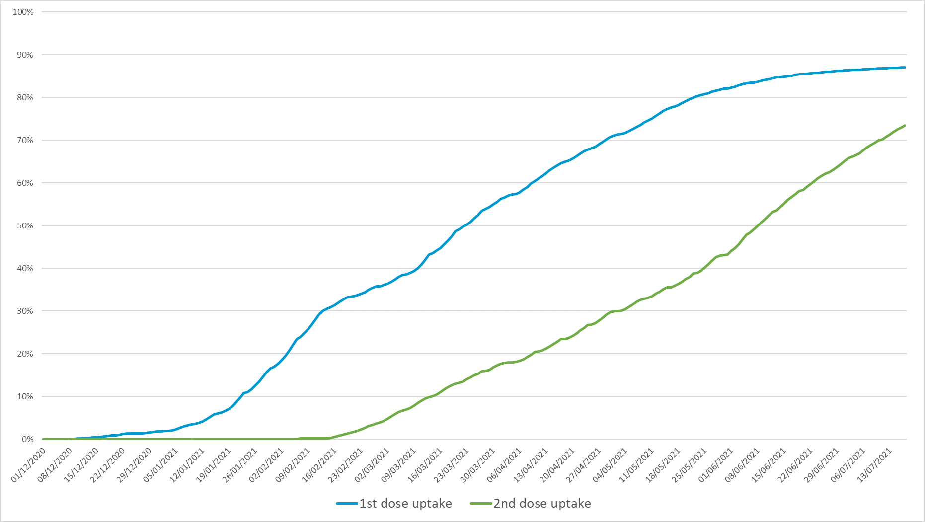 Despite an average vaccine first dose uptake of 87% in those aged 16 and over in Wales (72% of the total population), it will be extremely difficult, if possible, to reach population immunity. Factors affecting the likelihood of achieving population immunity include: lower vaccine uptake in younger age groups, a significant proportion of those aged under 18 being ineligible for vaccines, a non-uniform distribution across Wales and across age groups, R0 of the dominant delta variant and other emerging variants, the proportion of individuals immune from natural infection, the possibility of waning immunity and the need for booster vaccines, the possibility of emerging variants with increased transmissibility or mortality risk or ability to escape immune responses, and evidence that vaccines are not 100% effective.