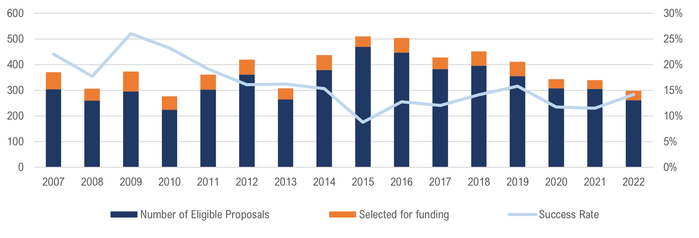 To take an illustrative snapshot as a starting point, in 2022 application numbers had declined to around half the 2015 levels (2022 being the last full year of data and 2015 the last year before the Brexit referendum). The number of projects selected for funding in 2022 was around 90% of 2015 due to higher success rates of the applications submitted. This pattern can be seen at UK and Welsh levels.