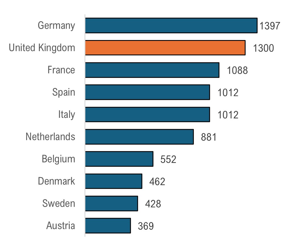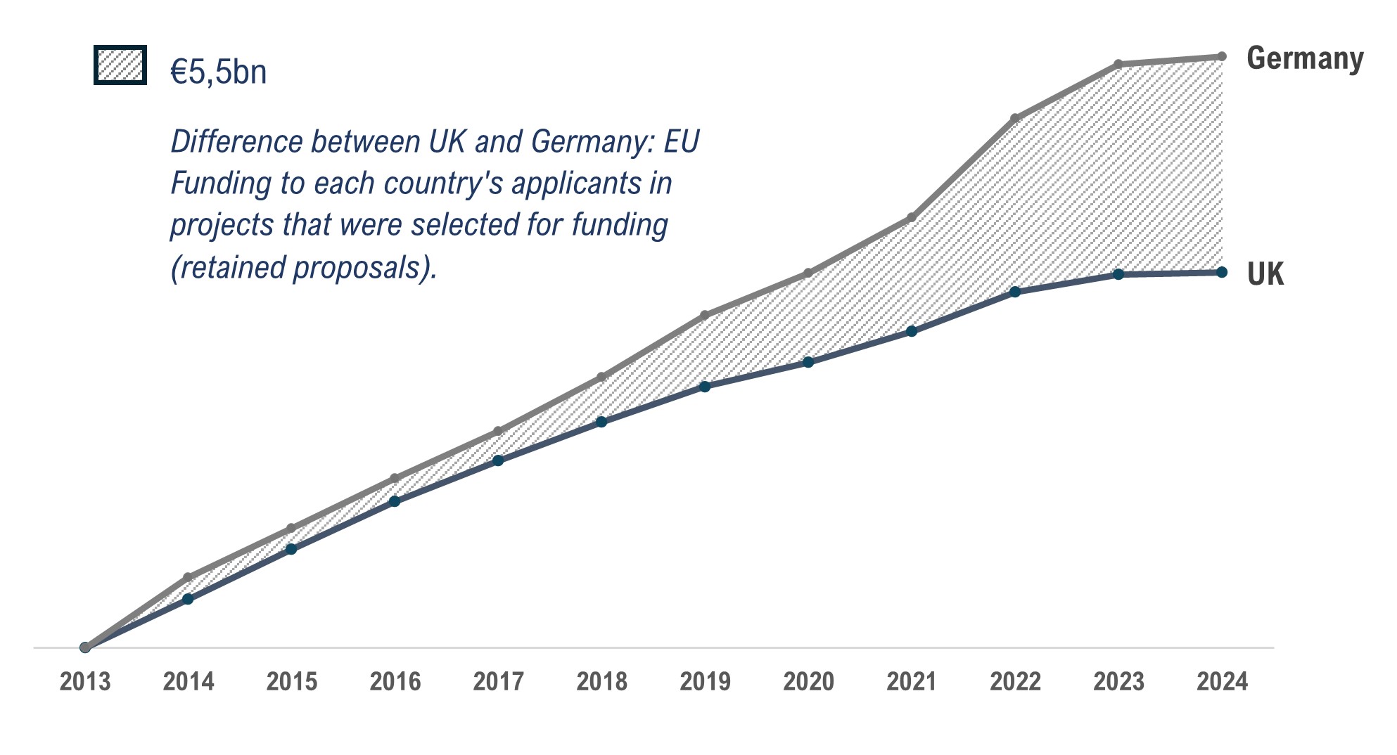 The UK has had access throughout Horizon Europe as a third country with funding from a domestic funding guarantee, but uncertainty and political difficulties have nevertheless taken a toll. Up to 2016, the UK tracked Germany as one of the top countries applying to Horizon but a gap has formed, with Germany’s approvals totalling an extra €5.5 billion.