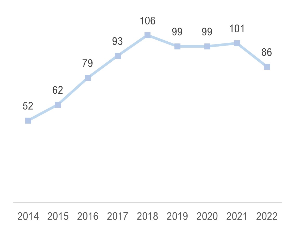 In relation to application numbers, Wales seems to have suffered from the late association to Horizon Europe in approximately the same way as the UK as a whole. The number of Welsh and UK applications dropped from 2016, and by 2022 were at around half the 2015 level.