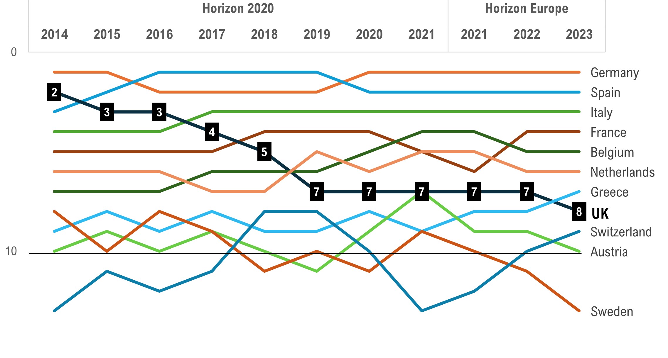 While individual business and researcher bids have surpassed Horizon 2020 in a few cases, it is in collaborative funds that more difficulties have arisen. Until 2016, the UK was positioned amongst the top three. The UK’s position has fallen to 8th place in 2023 under Horizon Europe Pillar 2.