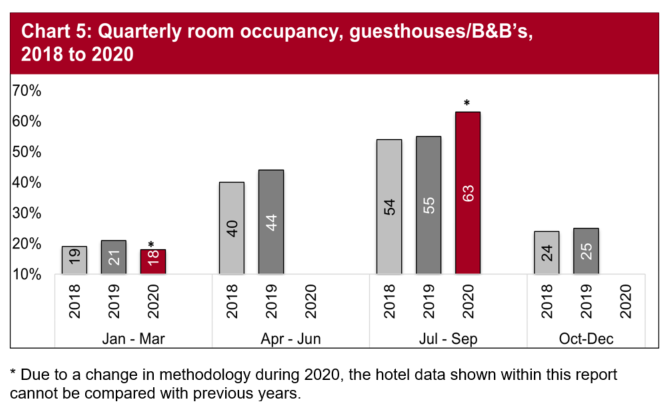 The first quarter of 2020 fell by 6 percentage points and as mentioned previously, the nature of the hostel and bunkhouse accommodation was a key factor in the slow recovery across the sector, with restrictions on the numbers staying in the multi-occupied rooms. The July to September 2020 quarter had fallen significantly, down from 66 percentage points in 2019 to 29 percentage points in 2020, a decrease of 37 percentage points.
