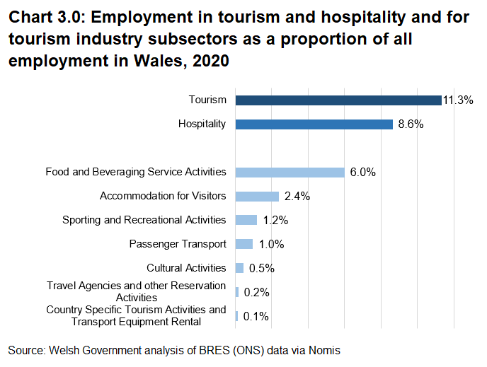 The sub-sector accounting for the largest proportion of employment in 2020 was Food and Beveraging Service Activities with 6.0% (80,000) of employment in Wales followed by Accommodation for Visitors with 2.4% (32,000).