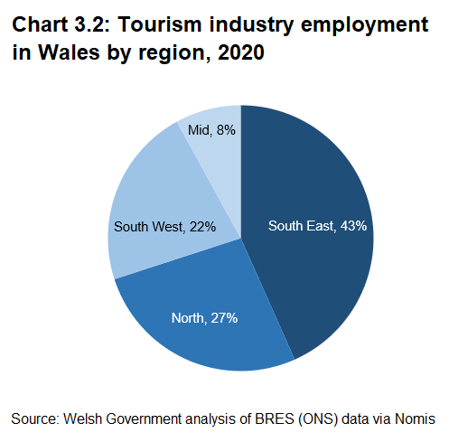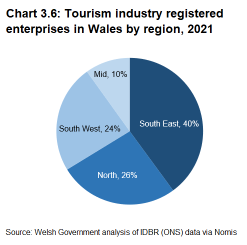 Similarly to employment distribution, the largest share of tourism enterprises in Wales was in the South East (40%) and the smallest share was in Mid Wales (10%).