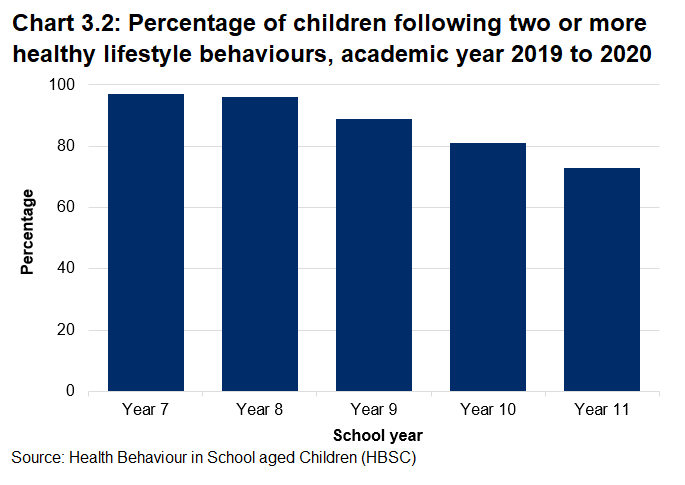 In 2019, 95% of 11 to 16 year olds reported that they did not smoke and 81% reported that they never or rarely drank alcohol. 48% reported that they eat fruit or vegetables every day and 18% reported that they had been physically active for an hour or more, seven days per week.