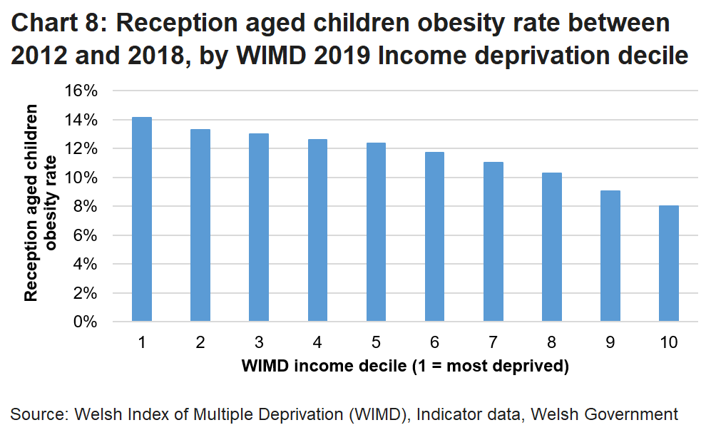 - Reception-aged children in the most income-deprived tenth of local areas were 76% more likely to be obese than those in the least income-deprived tenth of areas.
