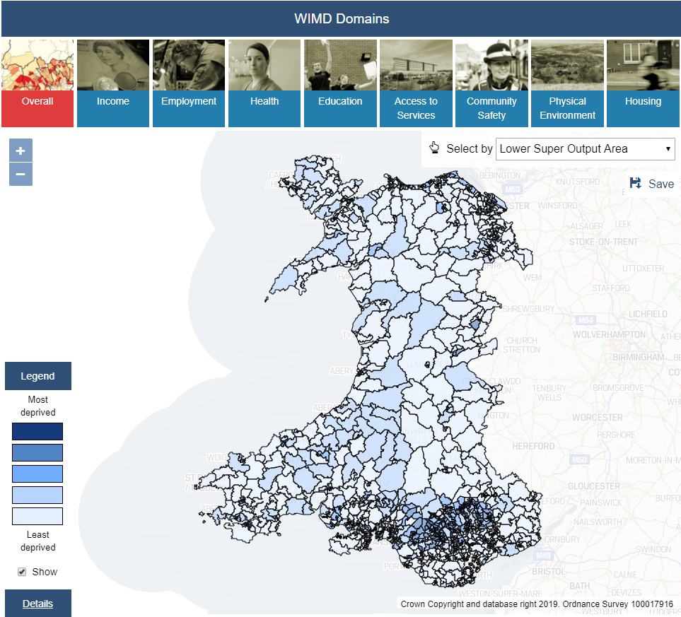 The WIMD 2019 interactive tool is a great way to view deprivation statistics for small areas of Wales (called Lower Super Output Areas or LSOAs for short).