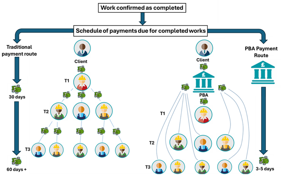 PBAs are ring-fenced bank accounts with trust status that act as a mechanism for making payments. PBAs replace the traditional multi-layered payment terms between tiers in the supply chain with simultaneous payments to the lead contractor and supply chain partners. Traditional payment methods have resulted in sub-contractors commonly having to manage 60-90 day payment terms. Payments via a PBA typically take between 3-5 days from the deposit of money into the account following certification of the payment schedule.